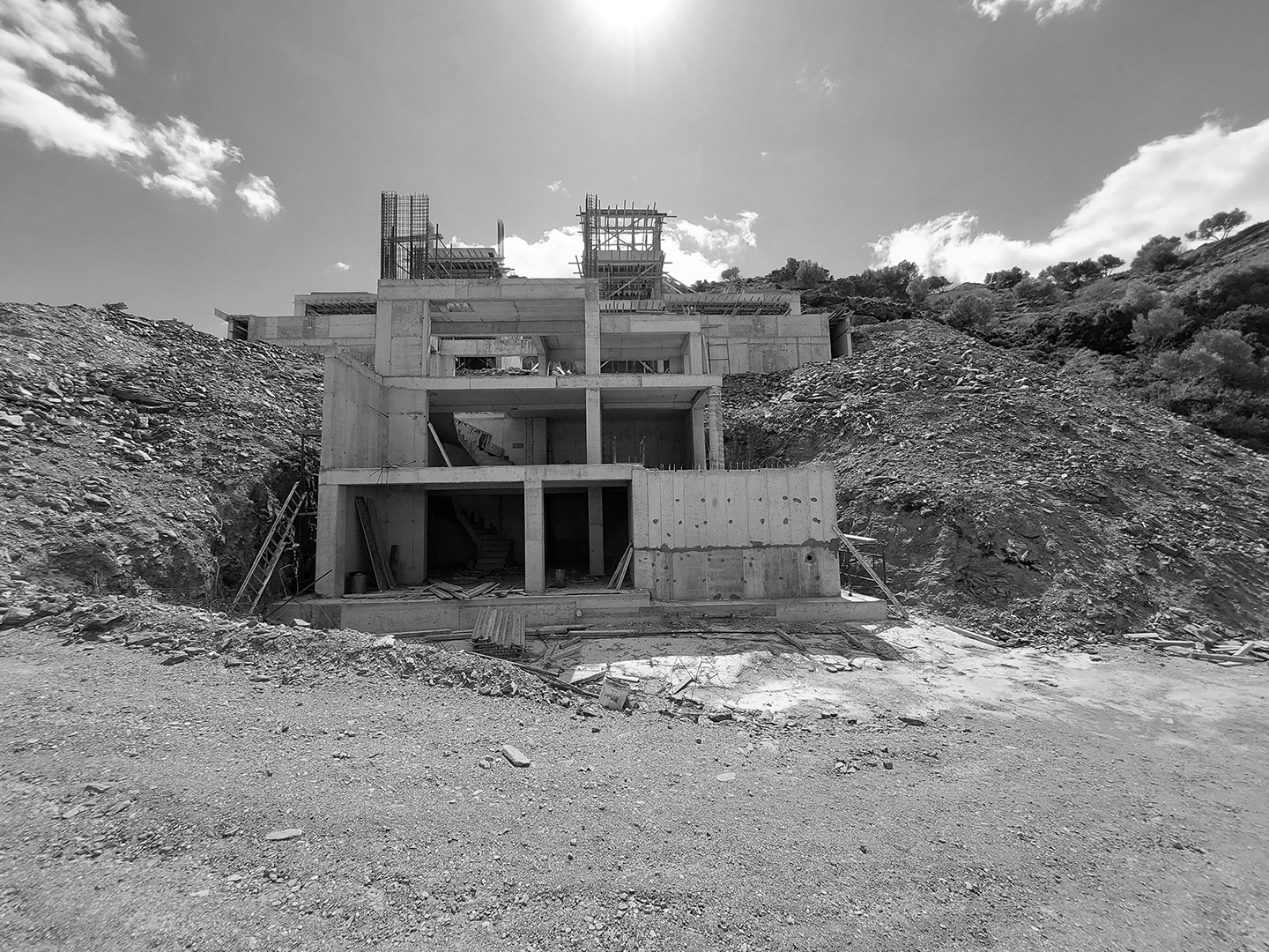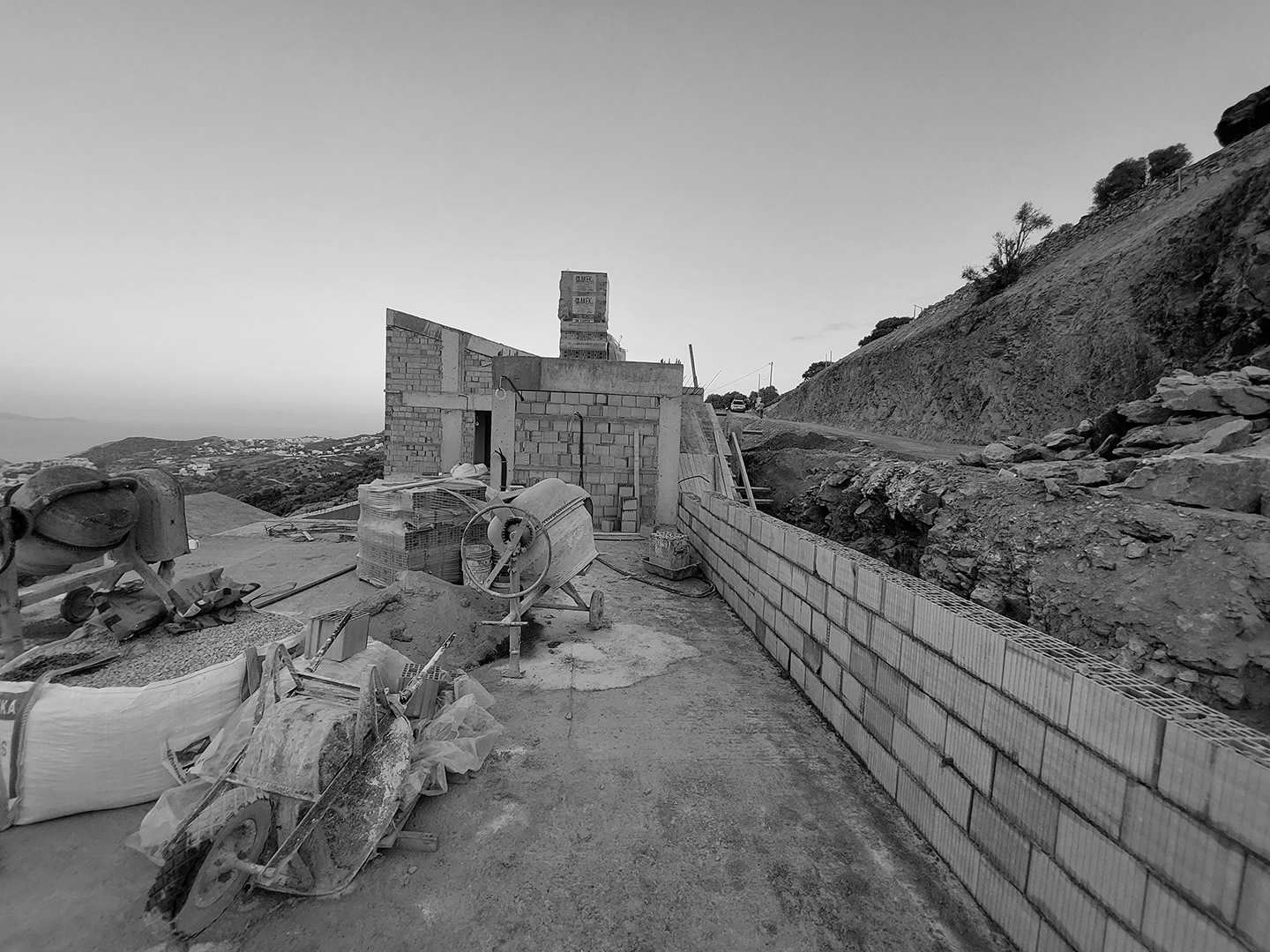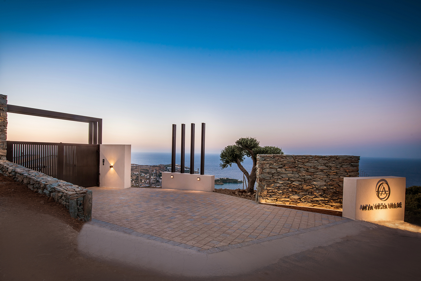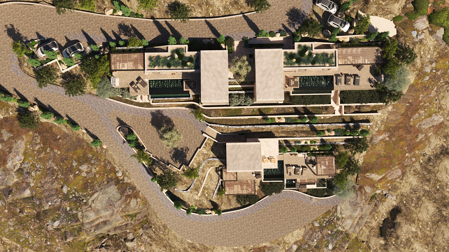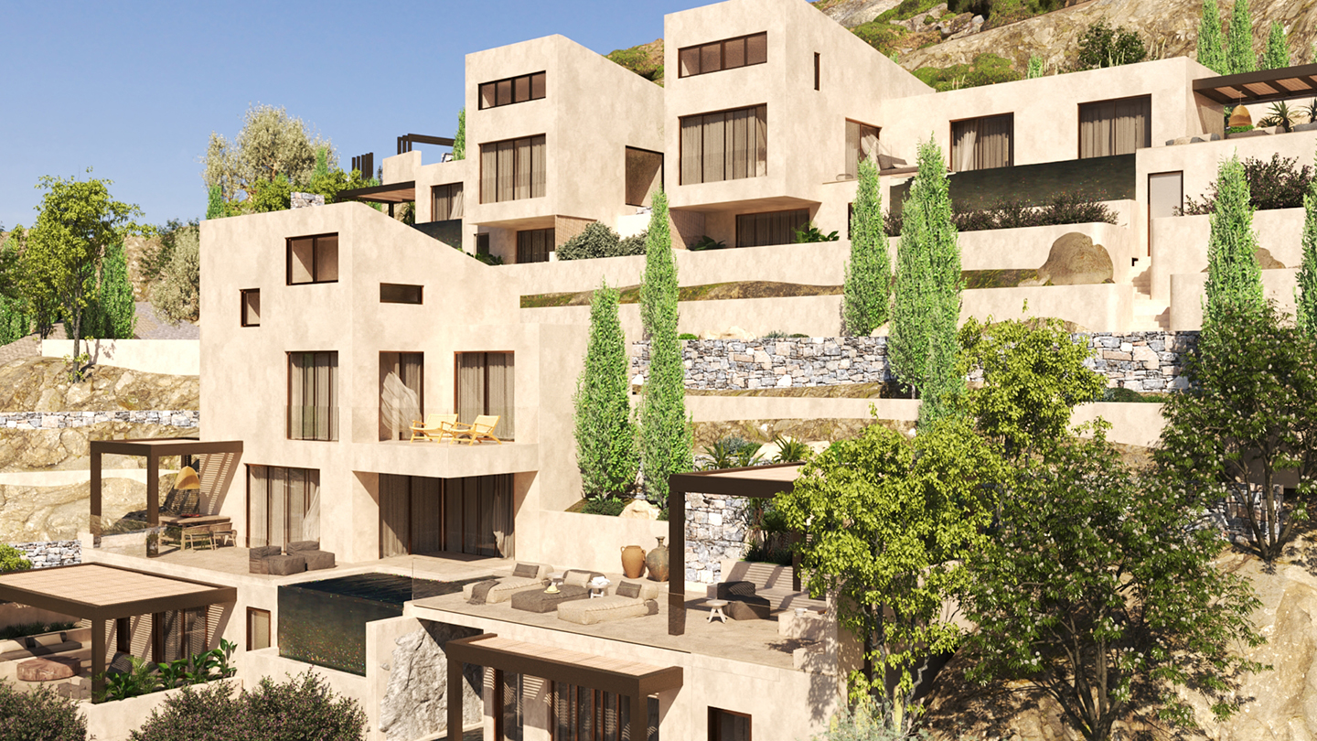 Σε αυτό το συγκρότημα πολυτελών βιλών, τα κτίρια των δυο κατοικιών κρέμονται πάνω στο βράχο. Τα μεγάλα ανοίγματα των κτιρίων προσφέρουν οπτικές πουλιών προς τον κόλπο της Αγίας Πελαγίας στη Κρήτη.
