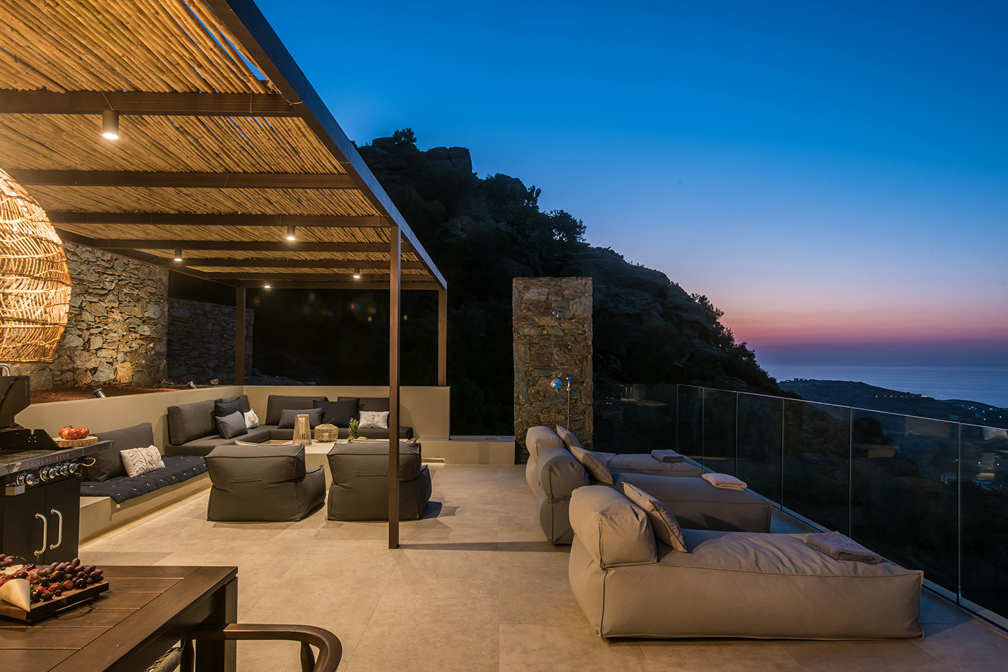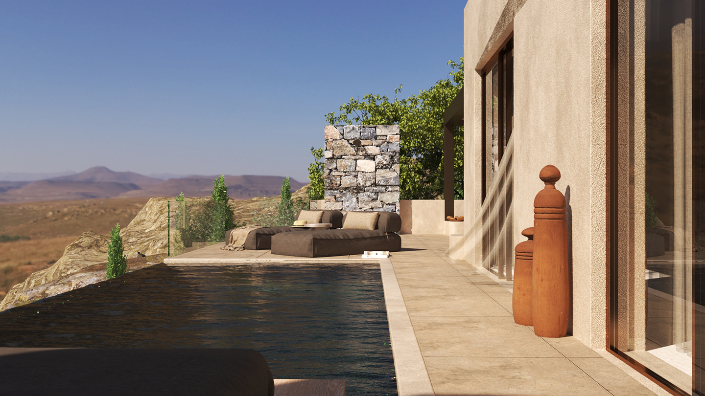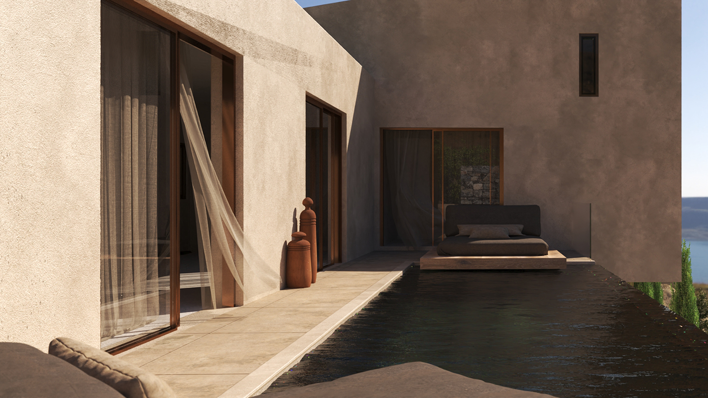 Η κύρια κρεβατοκάμαρα, το σαλόνι και το εξωτερικό καθιστικό διατάσσονται γύρω από την πισίνα προσφέροντας μια ανεπανάληπτη εμπειρία διαμονής. Το τζακούζι με τη θέα και η σάουνα προσθέτουν στην πολυτελή διαμονή. Η επιδίωξη μας ήταν να παρέχουμε με άνεση και πολυτέλεια την εμπειρία του βουνού και τις θάλασσας σε ένα ιδιαίτερο και προστατευμένο περιβάλλον.