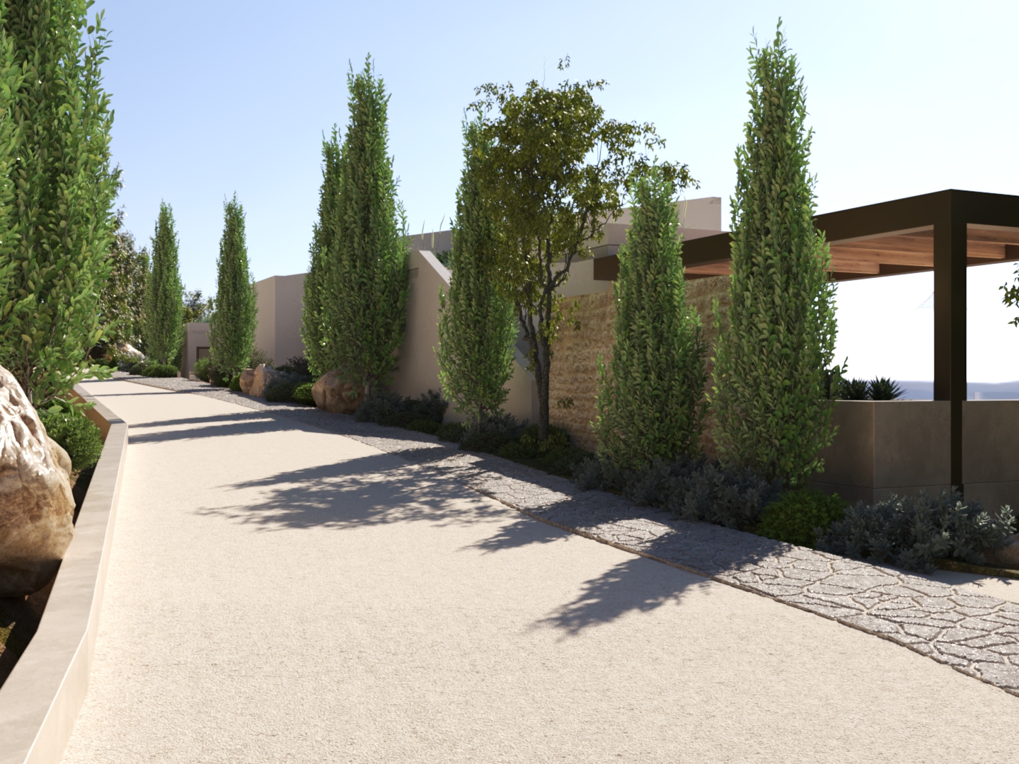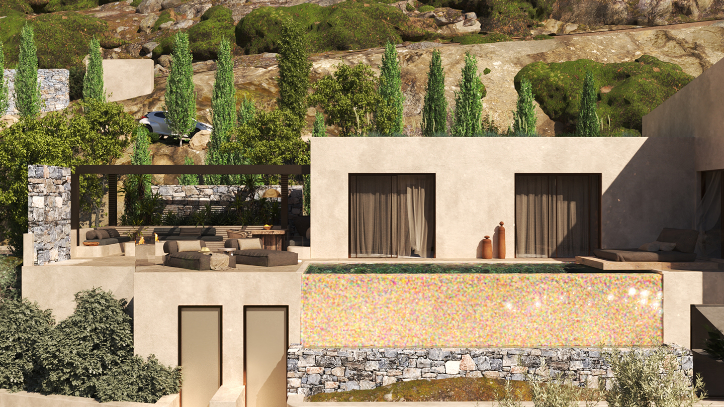Η κύρια κρεβατοκάμαρα, το σαλόνι και το εξωτερικό καθιστικό διατάσσονται γύρω από την πισίνα προσφέροντας μια ανεπανάληπτη εμπειρία διαμονής. Το τζακούζι με τη θέα και η σάουνα προσθέτουν στην πολυτελή διαμονή. Η επιδίωξη μας ήταν να παρέχουμε με άνεση και πολυτέλεια την εμπειρία του βουνού και τις θάλασσας σε ένα ιδιαίτερο και προστατευμένο περιβάλλον.
